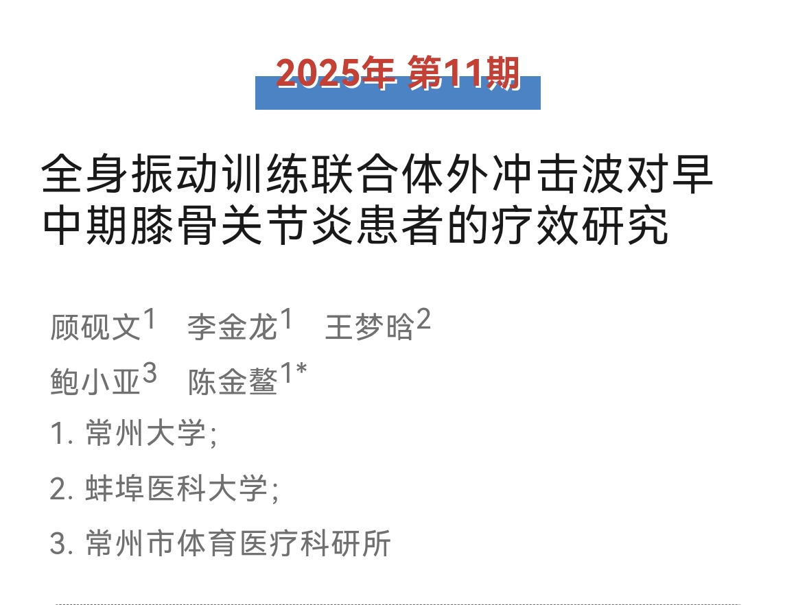 近日,我院2024级运动康复方向在读硕士研究生顾砚文以第一作者身份在CSSCI来源期刊《中国体育科技》上发表高水平研究论文《全身振动训练联合体外冲击波对早中期膝骨关节炎患者的疗效研究》,运动健康科学实验中心主任、硕士研究生导师陈金鳌为论文通信作者。