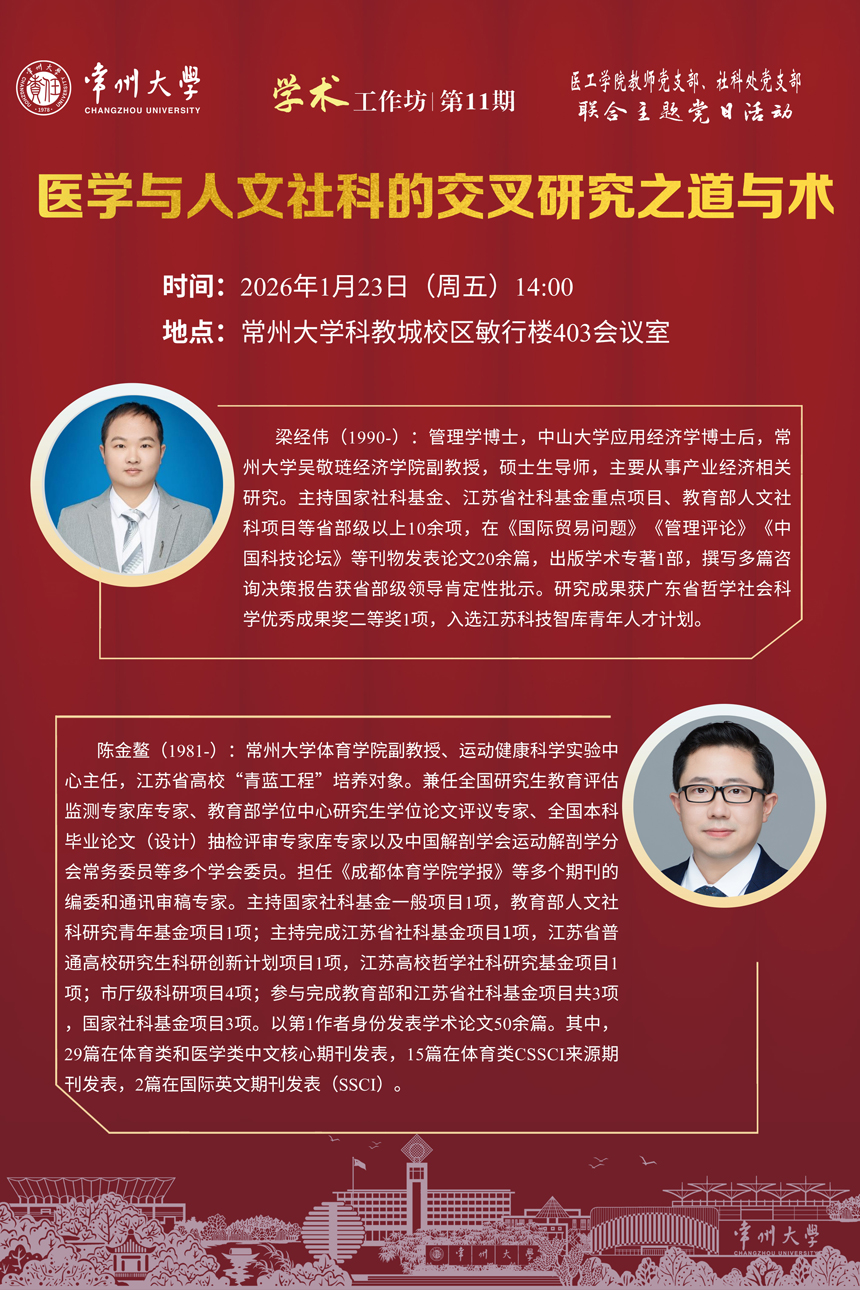 1月23日下午,医学与健康工程学院教工第二党支部与社科处党支部联合举办的“学术工作坊|第11期”暨联合主题党日活动在常州大学武进校区敏行楼403会议室顺利举行。我院运动健康科学实验中心主任、江苏高校“青蓝工程”优秀青年骨干教师陈金鳌作为受邀主讲嘉宾之一,以《体·护交叉,研·思并进——跨学科视域下的生命健康科学研究》为题,为医学与健康工程学院护理专业教师深入分享国家社科基金项目的申报经验与撰写策略。本次学术工作坊由护理学科与专业带头人张琳琳教授主持。 陈金鳌结合其成功获批国家社科基金项目的实践经验,从科研心路、项目设计、跨学科交叉等多个维度进行了系统阐述。首先,他回顾了自身作为青年教师的科研成长历程,分享了科研路上的成功经验与反思,真实生动的案例引发了在场教师的广泛共鸣。随后,他围绕“从论文到课题”的转化路径,详细解析了科研项目的设计思路与方法,并结合自身在“体育学—医学—护理学”这一交叉领域的研究实践,阐述了如何实现跨学科间的深度融合与创新。最后,他还分享了申报国家社科基金过程中的心得体会与策略建议,为在座教师提供了务实有效的指导。在交流环节,与会教师围绕运动与健康促进领域的跨学科研究选题、人文社科类课题申报趋势以及当前热门的AI辅助科研与写作等议题与陈主任展开了热烈讨论,现场学术氛围浓厚。 此次学术工作坊是护理专业教工党支部与社科处党支部推动党建工作与业务工作深度融合的一次积极实践,不仅为护理专业青年教师开展社科研究提供了方法与思路,也进一步激发了体育学院教师在运动与健康、医疗卫生与人文社科等交叉领域的研究热情与创新活力。体育学院将继续支持教师参与跨学科学术交流,积极拓展科研合作路径,助力我校在“体卫融合”“体护交叉”等前沿方向形成更多高水平研究成果,为服务“健康中国”战略贡献体育人的智慧和力量。