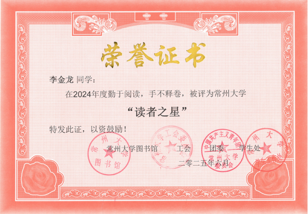 | 我院2023级研究生李金龙同学被评为常州大学“读者之星” |