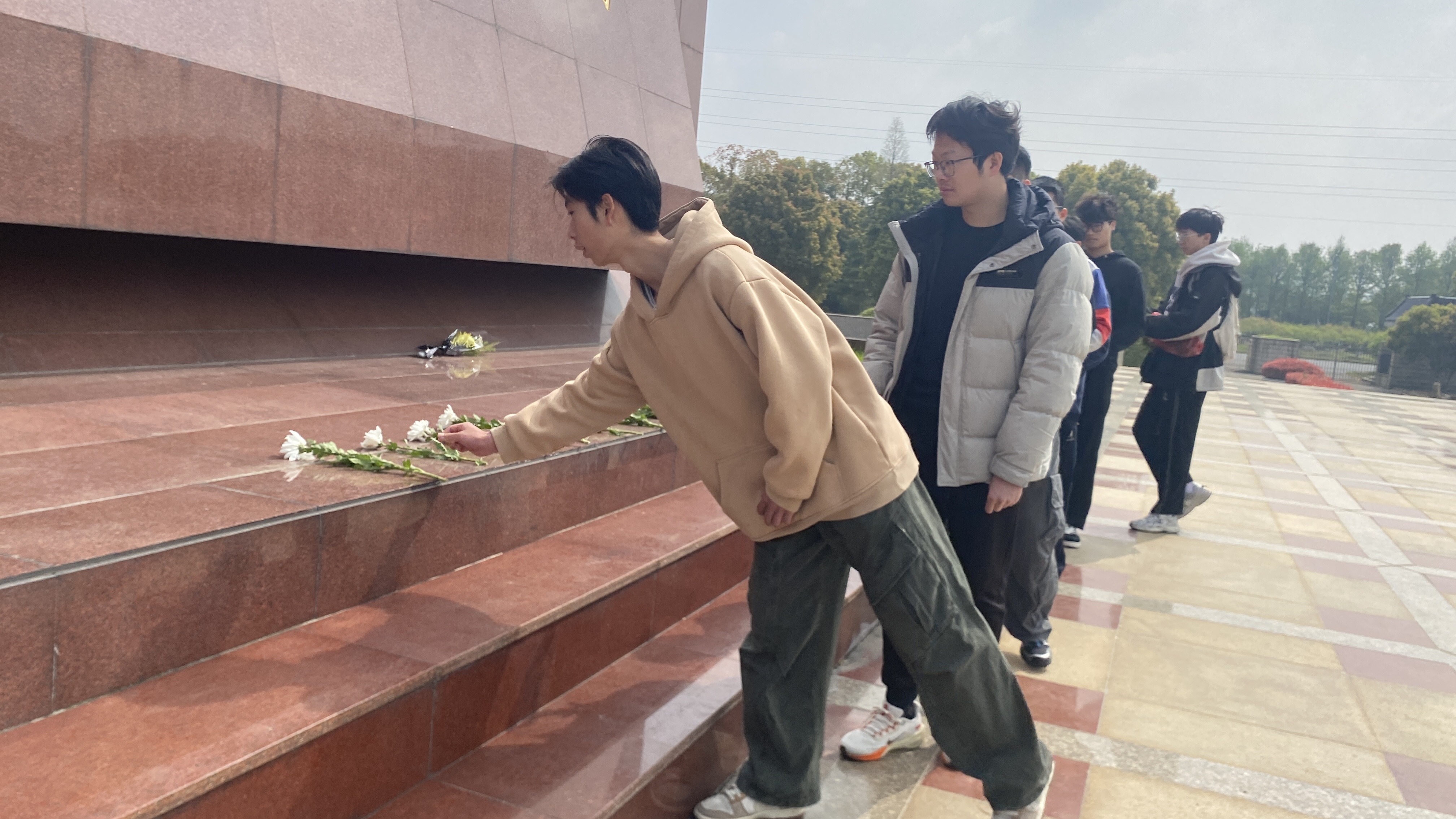献花环节,学子代表手持素菊,缓步拾阶而上,向烈士纪念碑敬献鲜花。一束束白菊静静安放,既是对英烈的深情告慰,也凝聚着“吾辈当自强”的坚定信念。