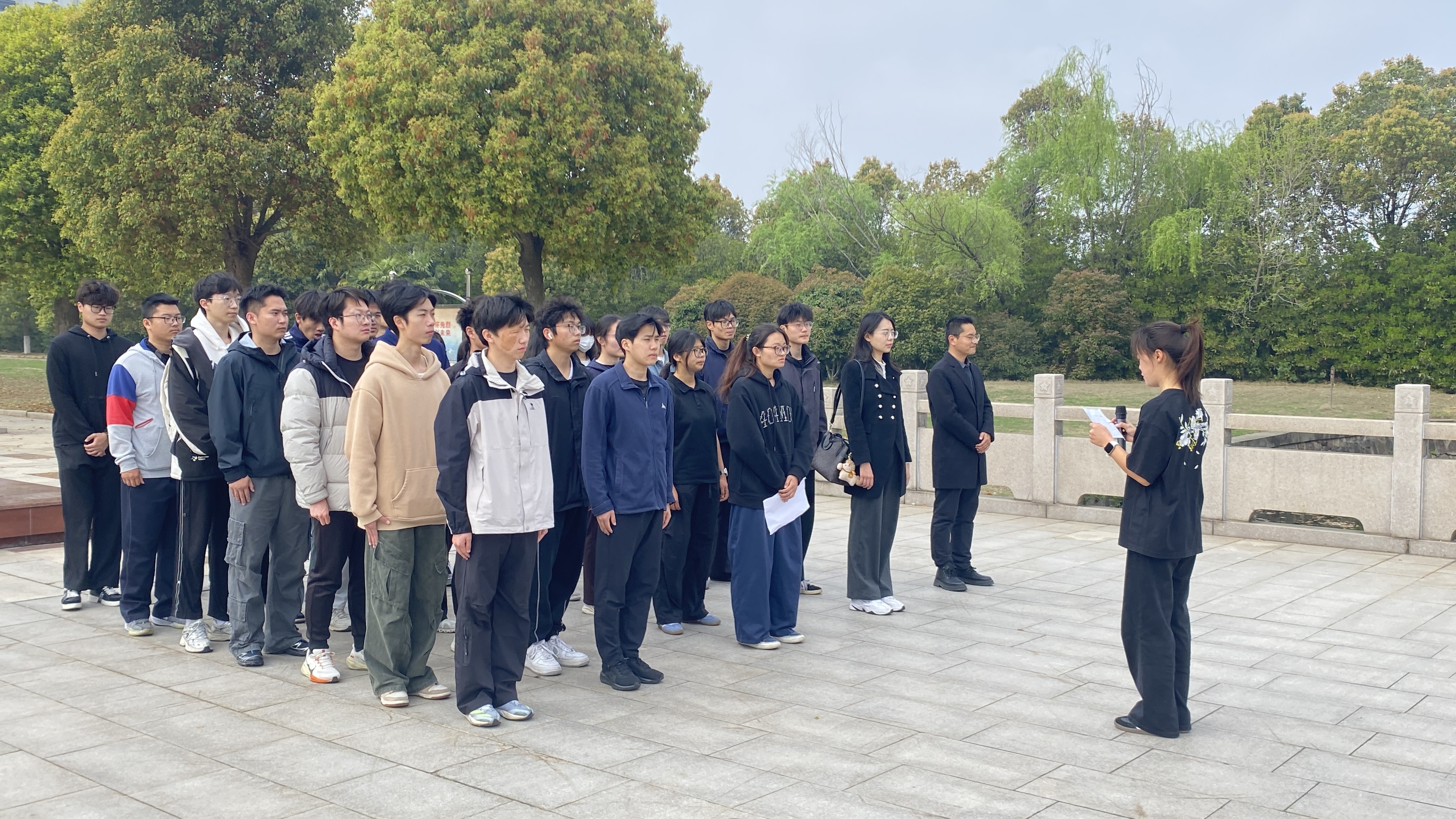 上午9时,祭扫仪式在雄壮激昂的国歌声中正式拉开序幕。全体青年学子肃立于革命烈士纪念碑前,齐声高唱中华人民共和国国歌。铿锵有力的旋律在陵园上空回荡,既表达了对革命先烈的深切缅怀,也激荡着每一位学子心中对祖国的无限热爱。