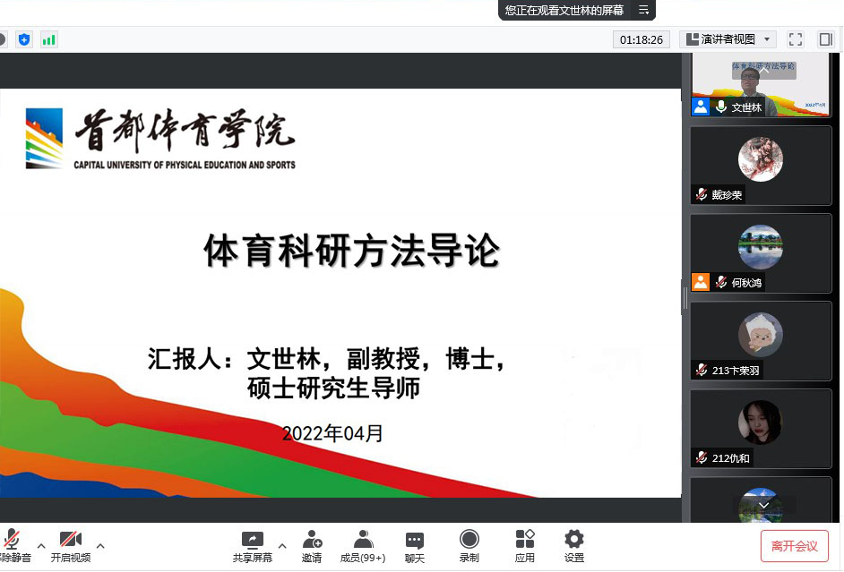 4月28日晚18:30,《体育科研方法导论》的讲座以腾讯会议的形式顺利开展。本次讲座主讲嘉宾为首都体育学院副教授、硕士生导师文世林,讲座由我院专业教研室主任何秋鸿主持,体育学院师生参会聆听学习。