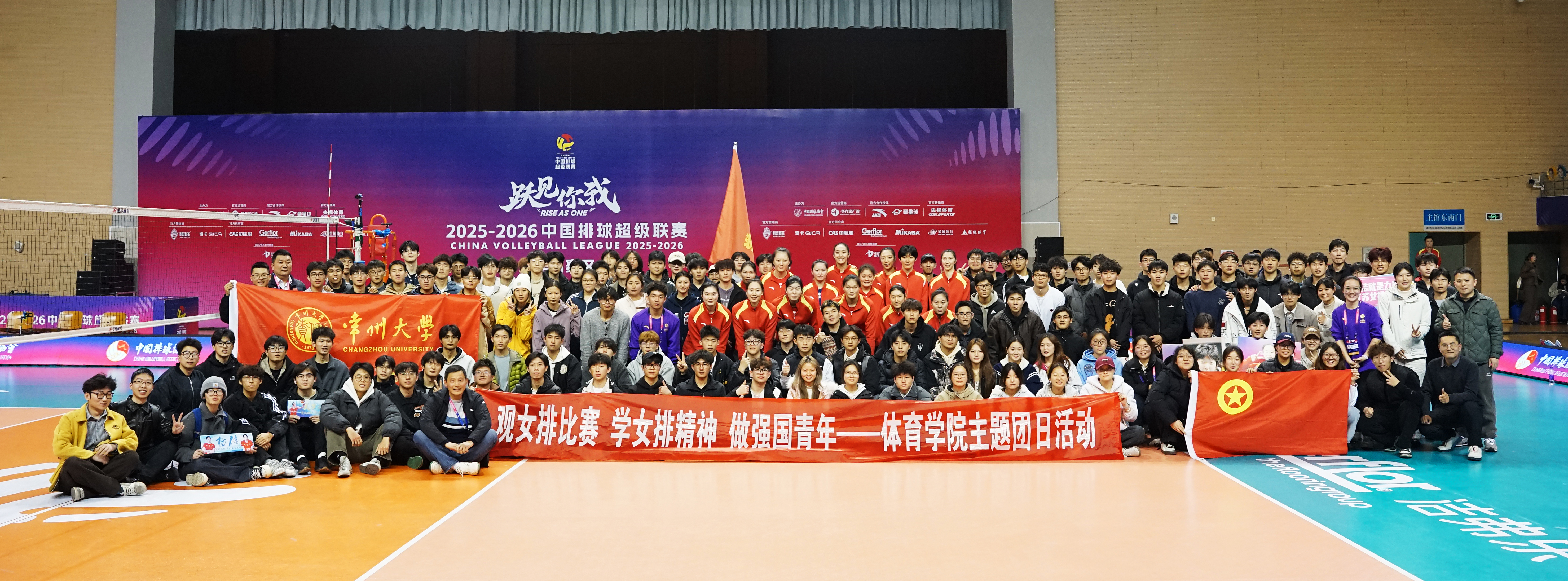 3月21日下午,2025-2026中国排球超级联赛女子半决赛第二场、江苏中天钢铁女排主场对阵天津渤海银行女排的比赛在常州大学科教城校区体育馆打响。为深入贯彻立德树人根本任务,将高水平赛事转化为鲜活思政课堂,引导青年学子感悟女排精神,厚植家国情怀,体育学院借机开展“观女排比赛 学女排精神 做强国青年”主题团日活动,选拔30余名志愿者参与赛事服务,组织200余名师生现场观摩,为江苏女排呐喊助威。学院党委书记王纪信、党委副书记桑月标出席活动。